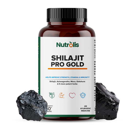 Nutrolis Shilajit Pro Gold | Fortified with 24 Carat Gold, Shilajit, Ashwagandha & Gokshura, For Strength, Stamina & Recovery, 60 Tablets